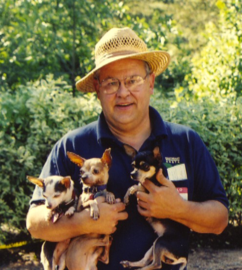 rescued Chihuahua "Pink" in his arms, who enjoyed being petted by her